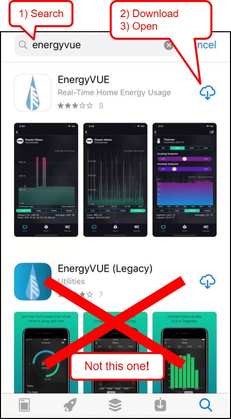 Go to the App Store or Google Play and search for “EnergyVUE” (ignore the Legacy version), or just click one of the buttons below: